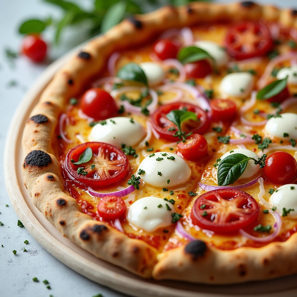 La pizza napoletana es rica en proteínas provenientes de la mozzarella y en antioxidantes gracias al tomate cherry. El aceite de oliva y los ingredientes frescos aportan beneficios para la salud. Para aquellos que buscan una versión más ligera, puedes reducir la cantidad de mozzarella o sustituir el pimiento rojo por vegetales adicionales como espinacas.