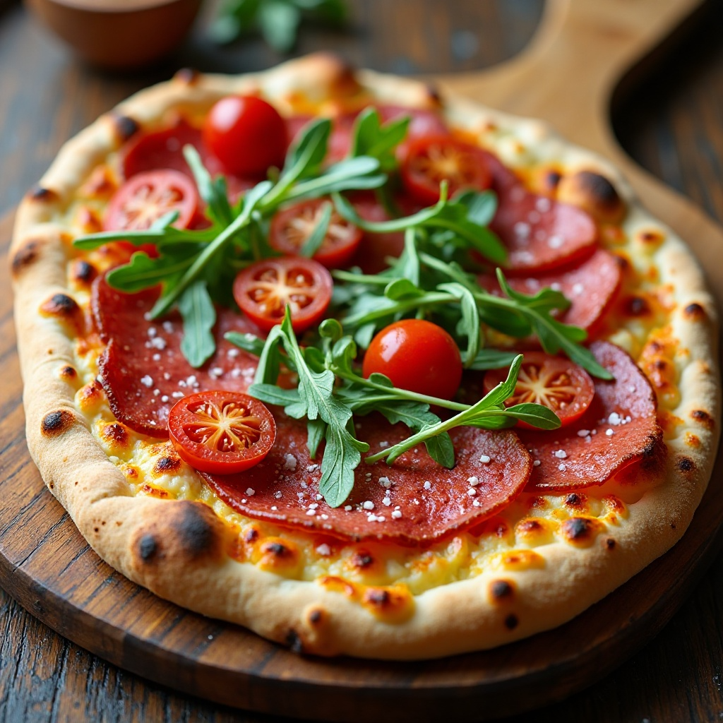 Esta pizza combina proteínas magras del Salami con la fibra de la rúcula, creando un plato equilibrado. El aceite de oliva es conocido por sus beneficios para la salud del corazón. Sin embargo, debido al contenido de sal en el Salami y la sal marina, aquellos con restricciones dietéticas deben ajustar las cantidades según su necesidad. Asegúrate de elegir un Salami con una proporción adecuada de sal para un sabor intenso sin excesos.