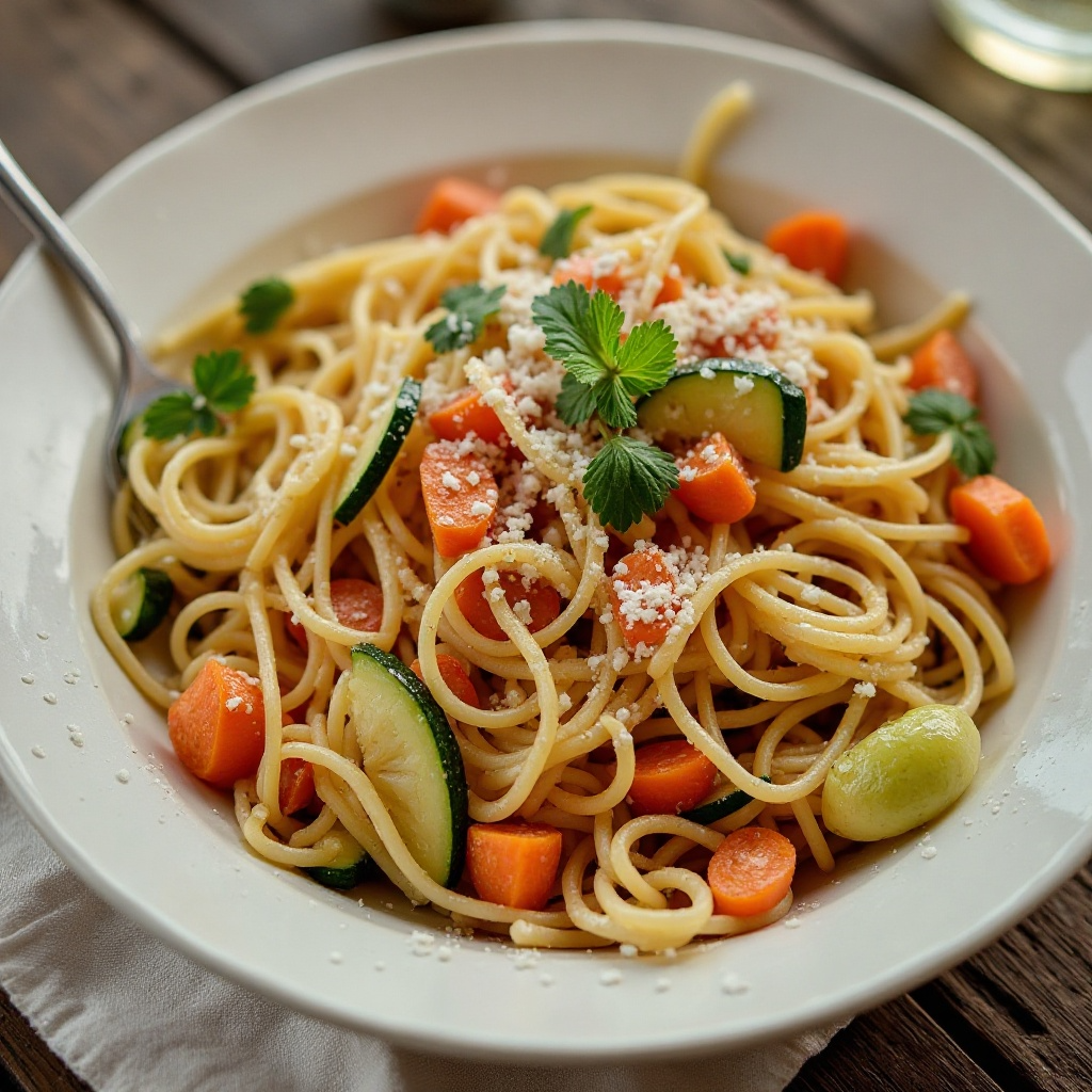 El plato de Pizzoccheri presenta una rica fuente de proteínas y carbohidratos complejos gracias a los espaguetis. Incorporar verduras frescas como zanahorias y calabacín aumenta el valor nutricional, aportando vitaminas y antioxidantes. La mantequilla agrega sabor pero también aporta grasas saludables. Para un plato aún más saludable, podrías optar por usar aceite de oliva en lugar de mantequilla para cocinar las verduras.
