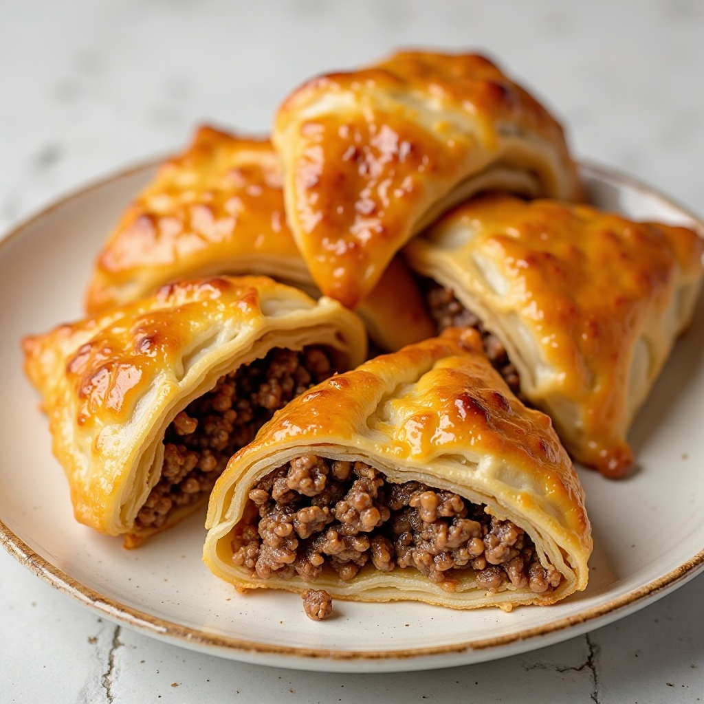 7. Divida la mezcla de carne en cuatro partes iguales y colóquela en el centro de cada hoja de masa de hojaldre.