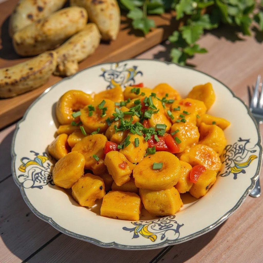 En Guinea Ecuatorial, un país situado en la costa occidental de África, los plátanos fritos son una parte esencial de su gastronomía. Esta receta, adaptada para Bata, una ciudad costera llena de vida, añade sabores locales con salsa de mango y cebolla, creando un plato versátil para acompañar con carne o como entrada. Perfecto para disfrutar de un toque de exotismo en casa.
