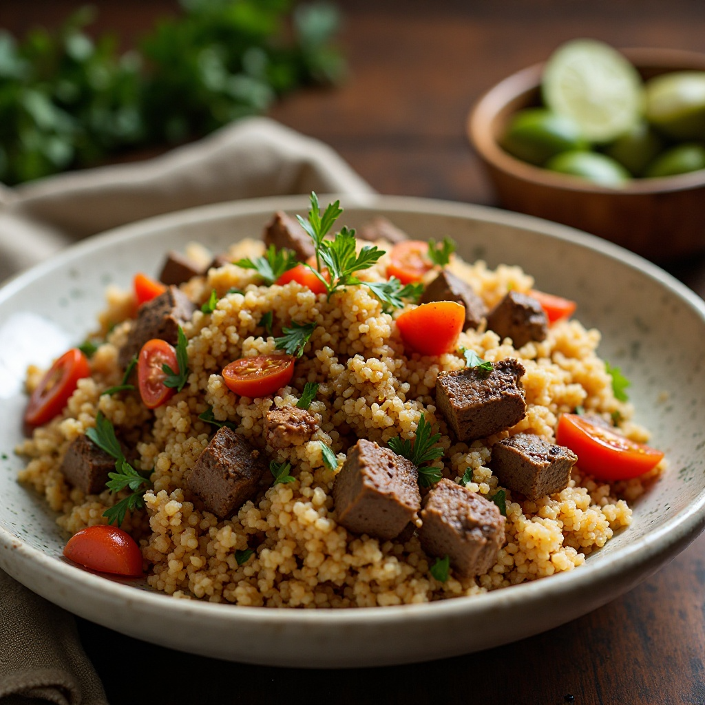 Este plato ofrece una excelente fuente de proteínas magras a través de la carne de cordero y la quinoa, conocida por su contenido de proteína de alta calidad y fibra. La Quinoa Qurt añade beneficios adicionales debido a su perfil nutricional superior, con altos niveles de vitaminas, minerales y antioxidantes. Reduce el consumo de sal añadiendo condimentos naturales como el comino y el pimentón dulce.