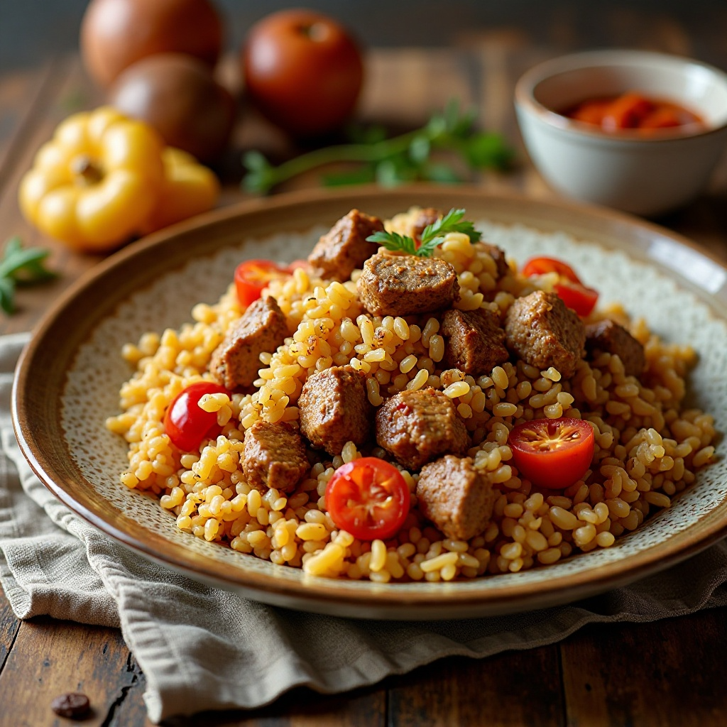 El plov es un plato emblemático de Azerbaiyán que varía ligeramente en cada región. Esta versión especial incorpora carne de Piti para Sheki, un tipo específico de ganado de pastoreo que es altamente valorado por su sabor y textura en la región de Sheki. Este plato es un banquete para el paladar, combinando sabores intensos con una rica historia cultural.