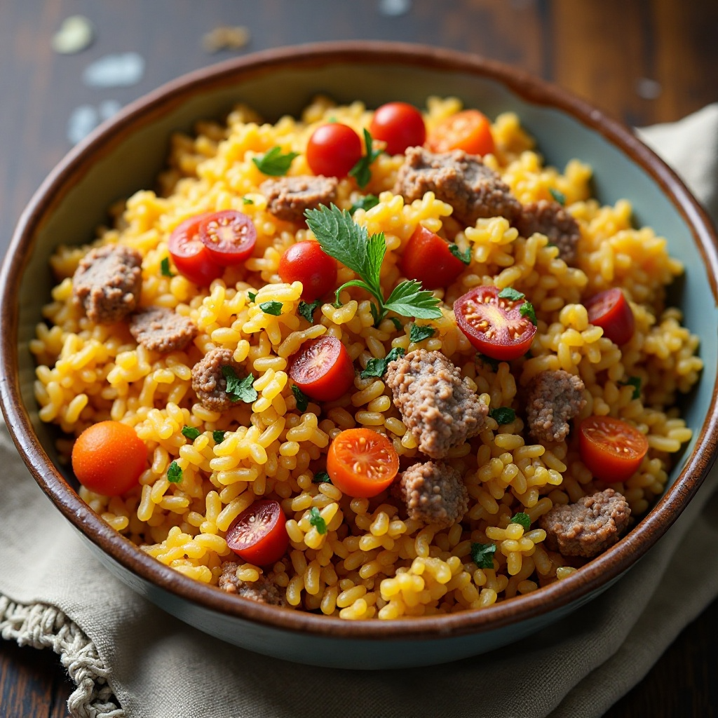 3. Reduce el fuego a medio-bajo y agrega el arroz. Mezcla bien con el contenido de la sartén para que cada grano esté cubierto por la mezcla de carne y especias. Añade suficiente agua para cubrir el arroz y sal al gusto.