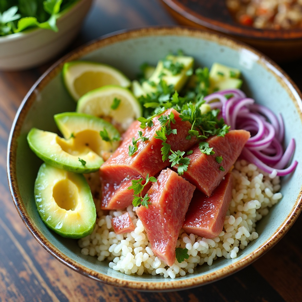 El poke bowl es una opción saludable, rica en proteínas magras (el atún), fibra (arroz integral o de grano completo y verduras) y grasas saludables (aceite de oliva y aguacate). Los ingredientes frescos utilizados no solo son deliciosos, sino que también aportan antioxidantes y nutrientes esenciales. Considera usar arroz integral para aumentar el contenido de fibra y nutrientes.