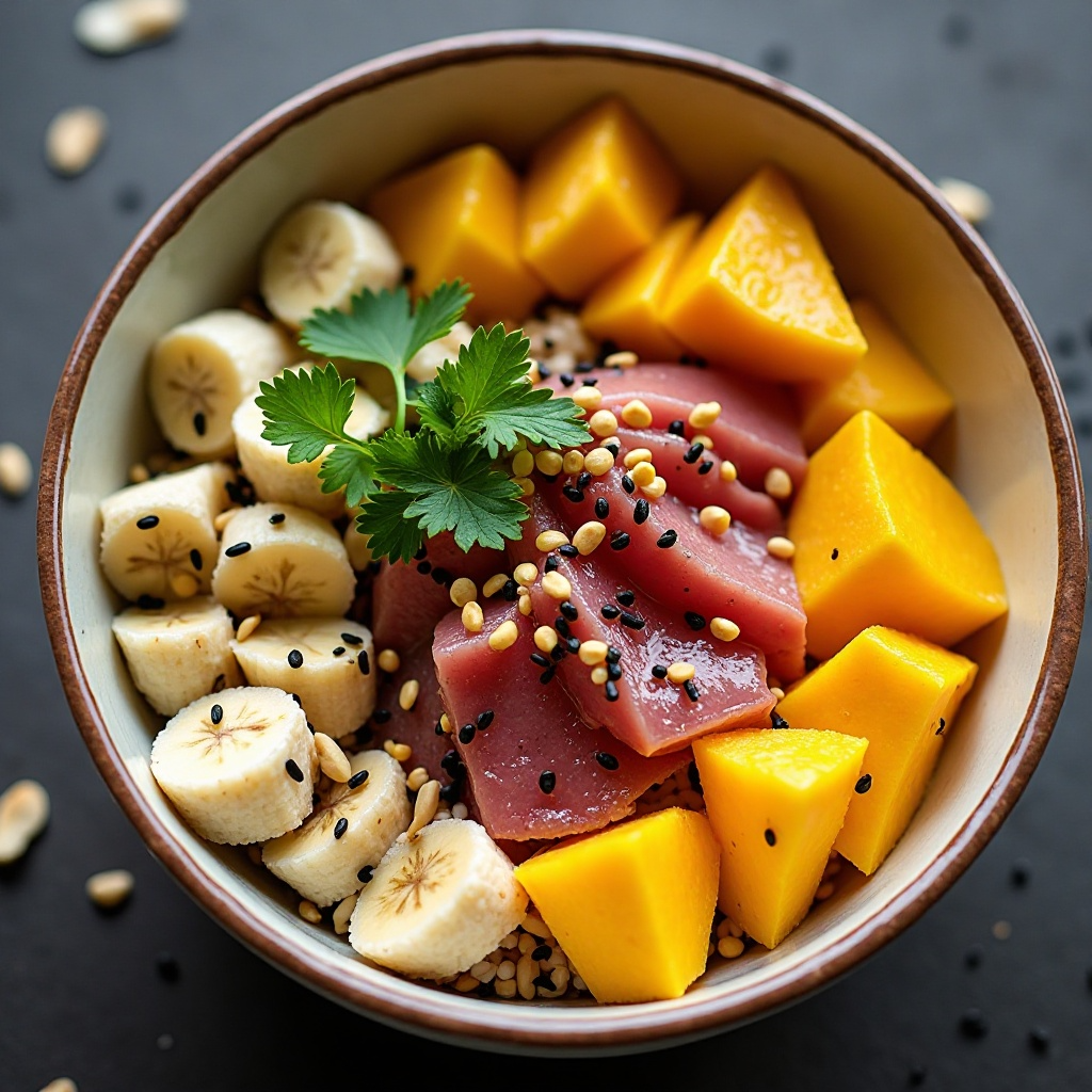 - Añade los dados de mango y las rodajas de plátano al tazón, mezclando suavemente para evitar que se rompan.
