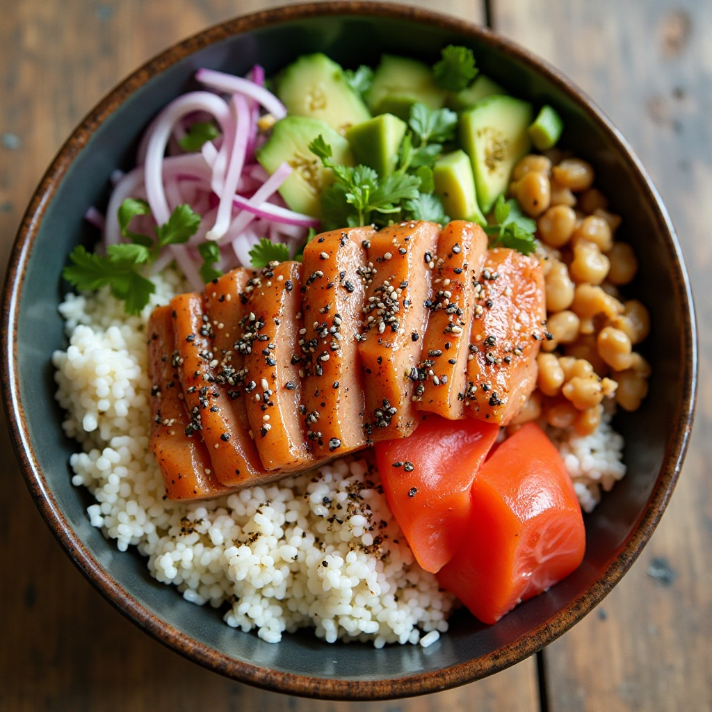 El Poke Bowl es una opción excelente para quienes buscan mantenerse saludables. El pescado proporciona proteínas magras, el arroz integral ofrece carbohidratos complejos y los vegetales aportan vitaminas y minerales esenciales. La salsa de soja baja en sodio ayuda a controlar los niveles de sodio, mientras que la opción de semillas de chía o cáñamo añade omega-3 y fibra.