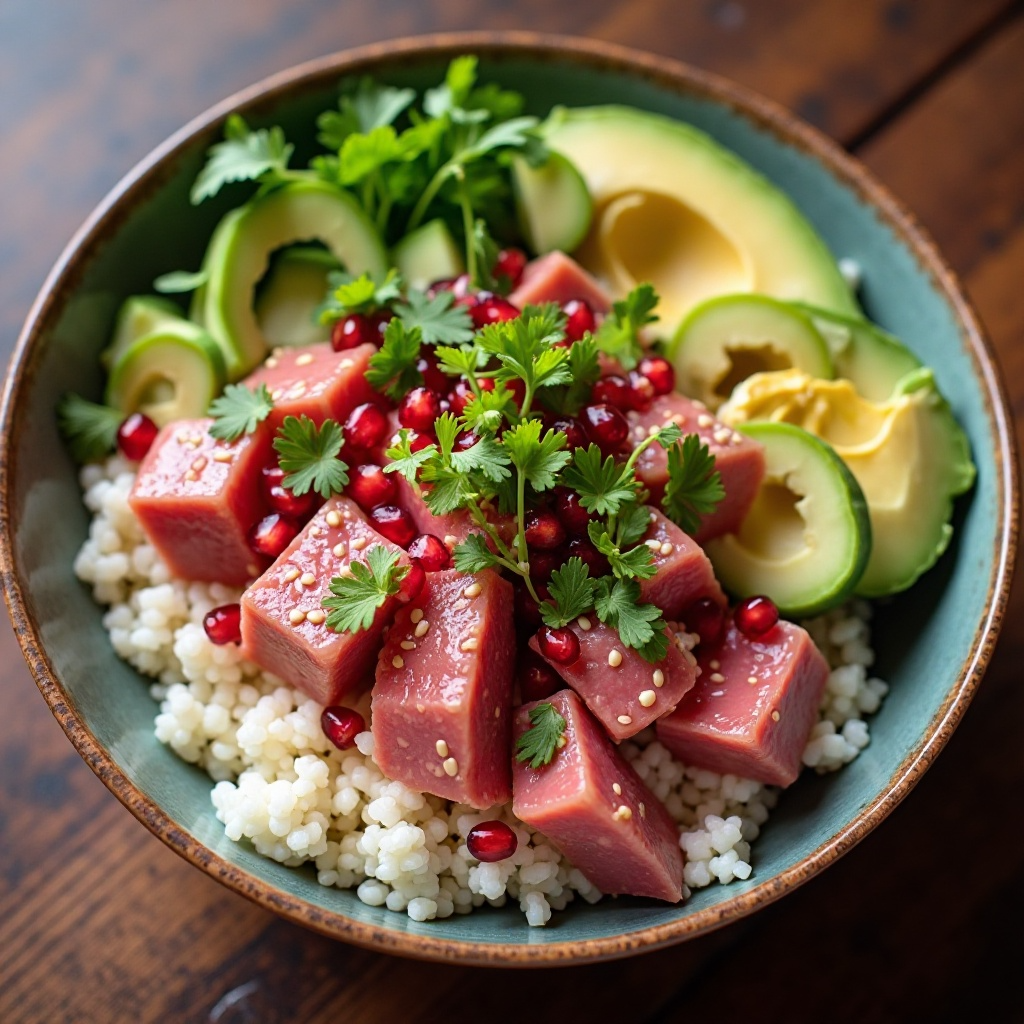 El poke bowl es una opción saludable debido a su alto contenido en proteínas, ácidos grasos omega-3 (gracias al atún), y antioxidantes (proviene del aguacate y el cilantro). Los ingredientes frescos como el atún y el pepino japonés son bajos en calorías y ricos en nutrientes. Para una versión más ligera, reduce la cantidad de aguacate o reemplázalo por una mezcla de espinacas o lechuga.