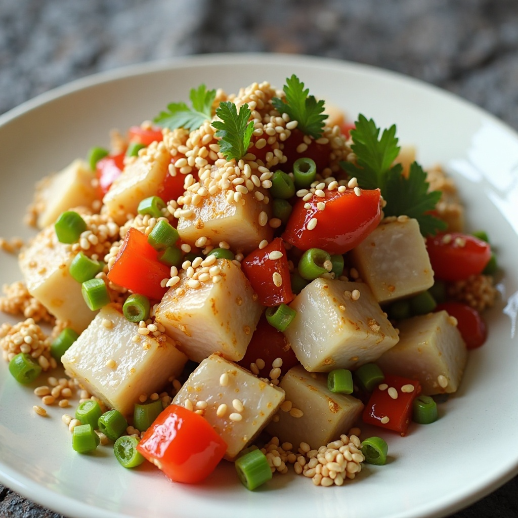 - Agrega los vegetales preparados a los trozos de pescado y mezcla con suavidad. Esparce las semillas de sésamo tostado sobre el plato justo antes de servir, añadiendo el toque final.
