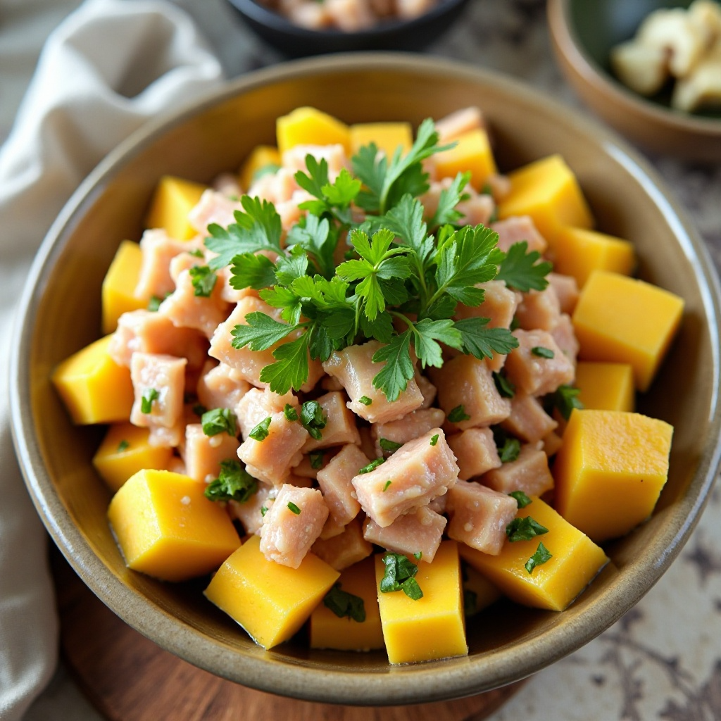 - Agrega al mismo tazón los cubos de mango, banana, y piña. Revuelve suavemente para combinar los ingredientes y asegurarte de que los cubos de fruta estén bien integrados con el pescado.
