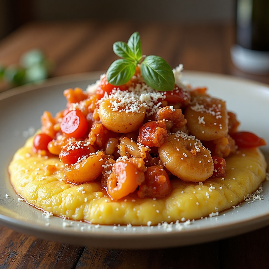 - Sirve un poco de ragu en cada plato de polenta, decorando con parmesano recién rallado.