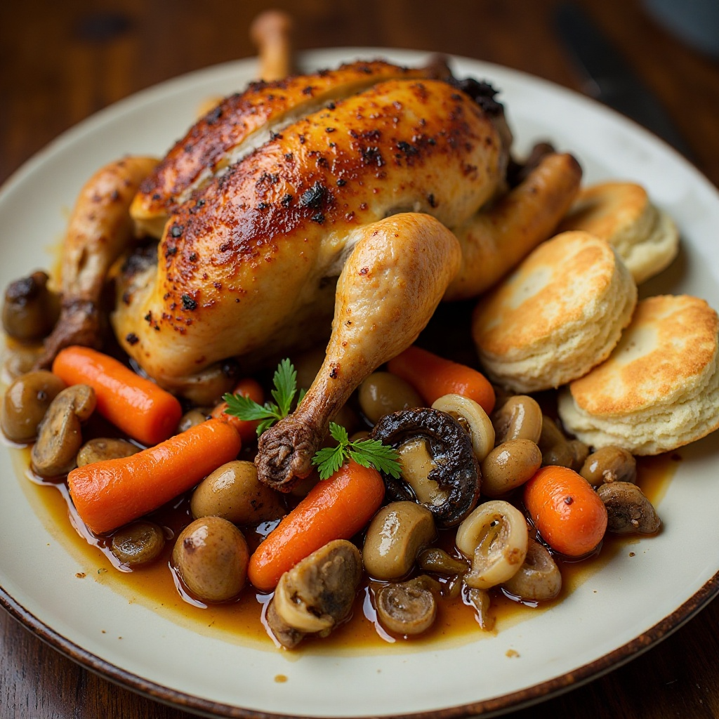 Este plato es una fuente rica de proteínas, vitaminas y minerales gracias a la combinación del pollo, patatas y verduras. Los biscuits, aunque ricos en calorías, aportan una textura crujiente y un sabor tradicional que muchos disfrutan. Para una versión más saludable, podrías reducir las grasas añadiendo menos mantequilla o utilizando aceite de oliva más ligero.