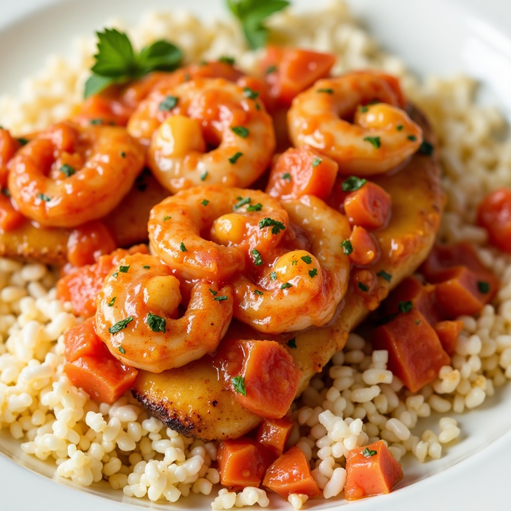 El pollo a la parrilla es un plato versátil y fácil de preparar que combina bien con una variedad de salsas. En Ridgeland, Mississippi, se aprecian sabores locales y frescos, lo que inspira esta versión con un toque a camarones y tomate frito, platos típicos del sur de los Estados Unidos.
