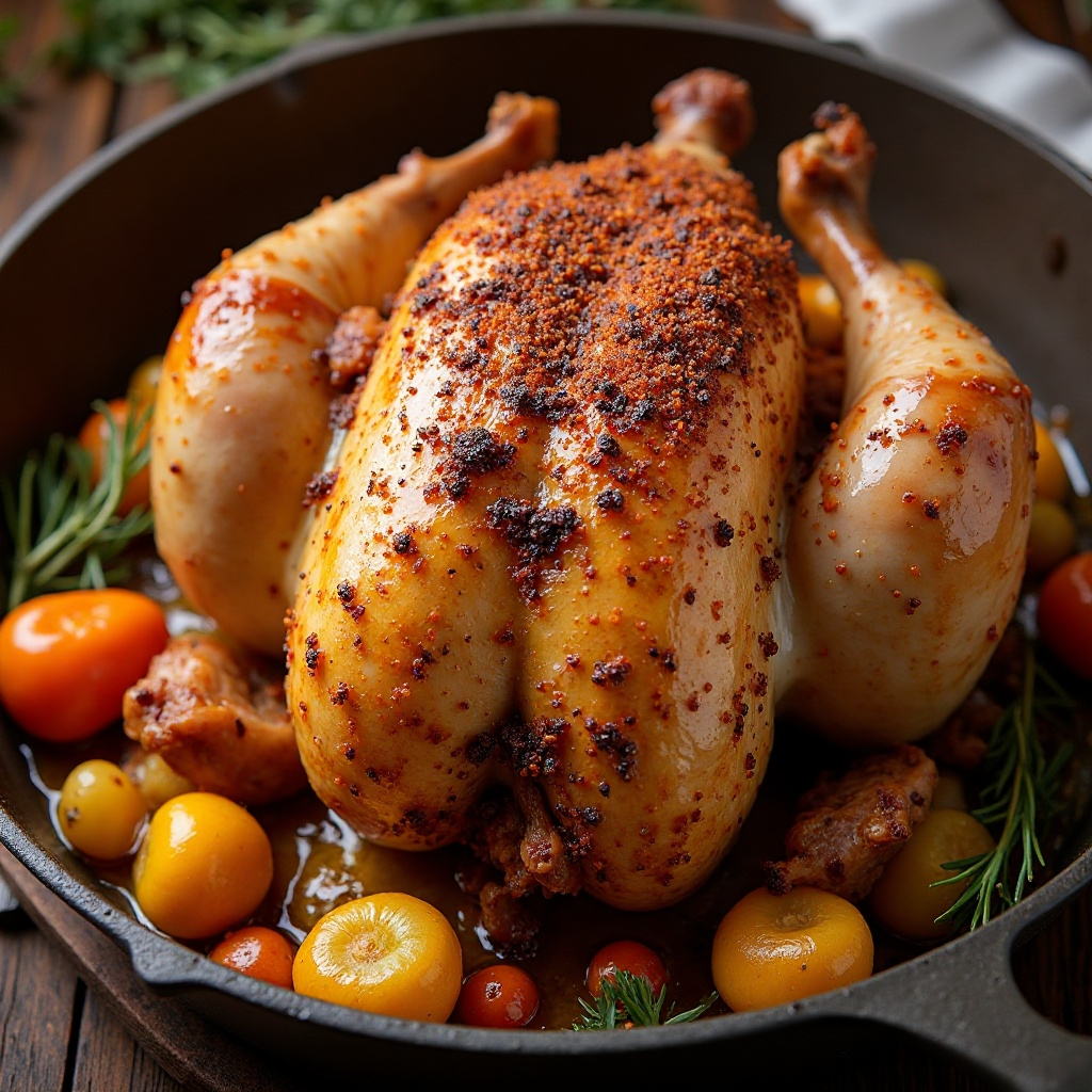 - Pasa el pollo por la mezcla de especias, asegurándote de cubrir todo el ave con un generoso recubrimiento. Deja reposar durante 30 minutos en la nevera para que los sabores se fusionen.