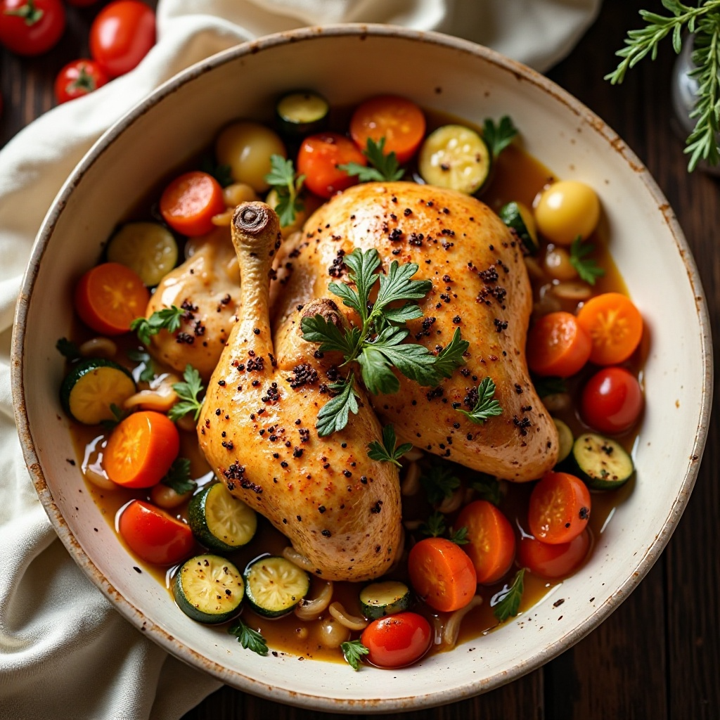 - Vierte el vino Montepulciano sobre el pollo y las verduras, asegurándote de que cubra el pollo. Añade la hoja de laurel, la zanahoria, el calabacín y los tomates cherry. Salpimienta al gusto.