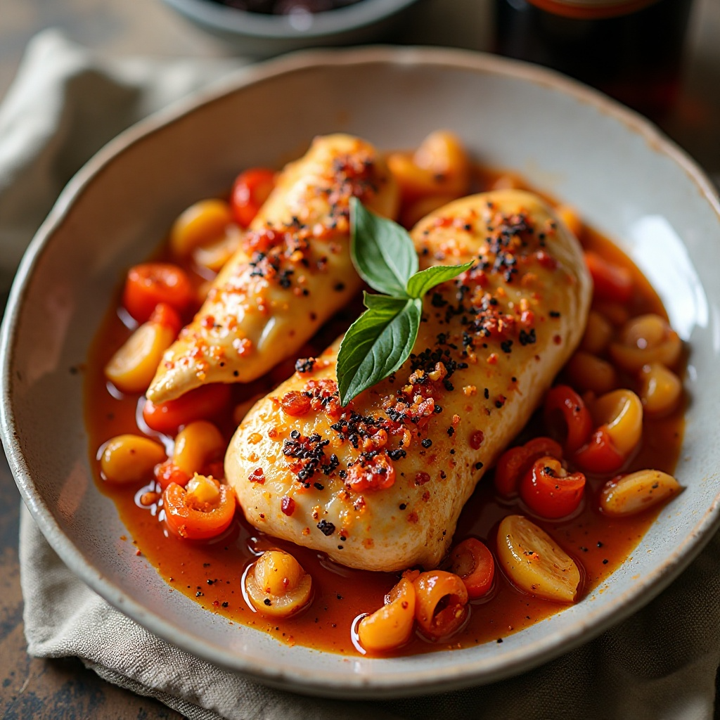 Este plato es una interpretación moderna del tradicional pollo alla diavola, originario de la región de Lacio en Italia. En el histórico pueblo de Civita di Bagnoregio, famoso por su estructura colapsada y su entorno único, se inspira un toque especial en este plato, utilizando vinos locales para agregar profundidad y sabor a la salsa.