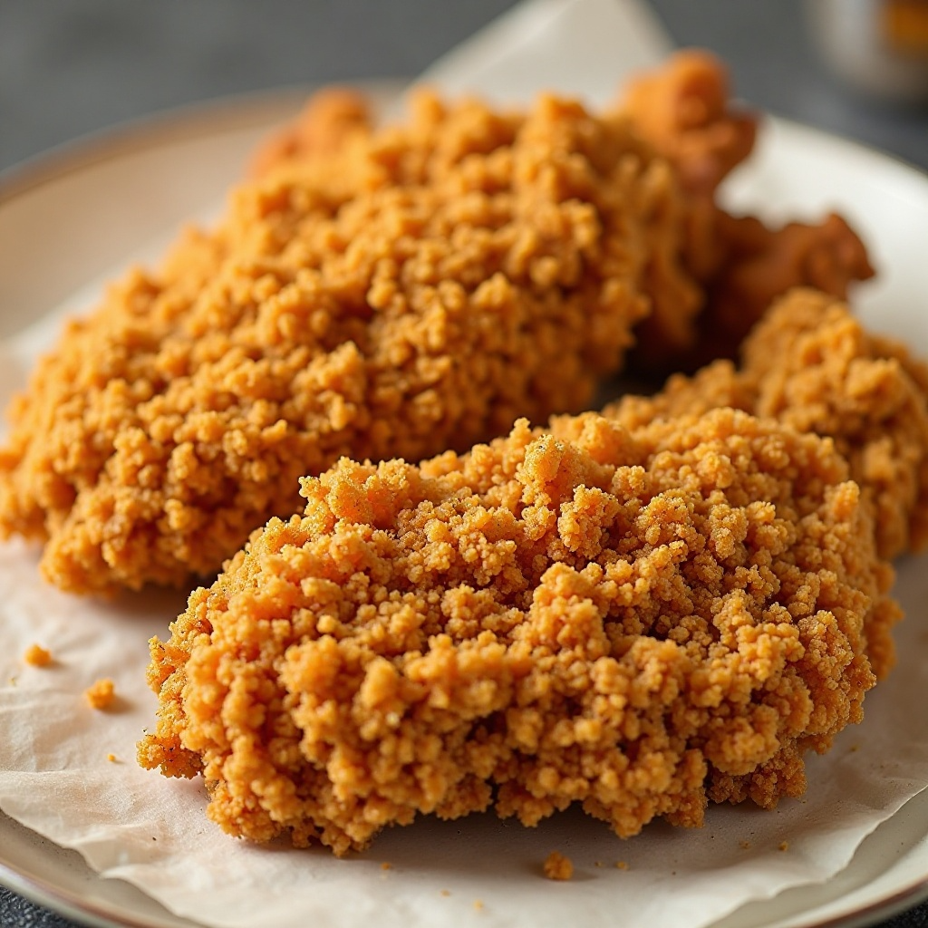 - Calienta suficiente aceite en una sartén profunda o freidora para freír a 375°F (190°C). Cuando el aceite esté caliente, fríe las piezas de pollo en lotes pequeños, asegurándote de no agitar el aceite para que se formen crujientes.
