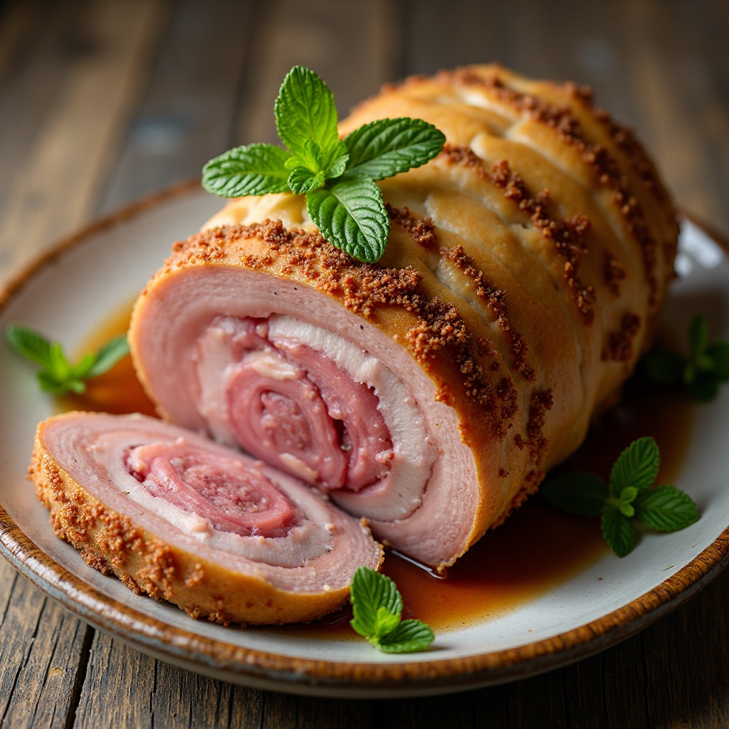 - Una vez listo, retira el porchetta del horno, deja que repose durante unos minutos antes de cortar y servir. Acompaña con pan duro y una guarnición fresca de hierbabuena para un toque final auténtico siciliano.