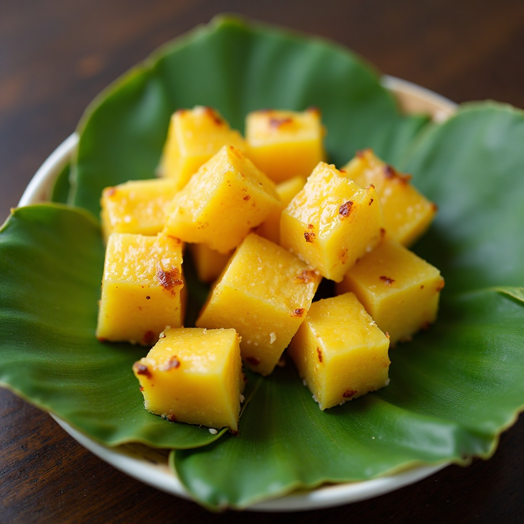 - Coloca los cubos de piña sobre las hojas de plátano, asegurándote de no exceder la capacidad de la hoja para evitar que se doblen o rompan.