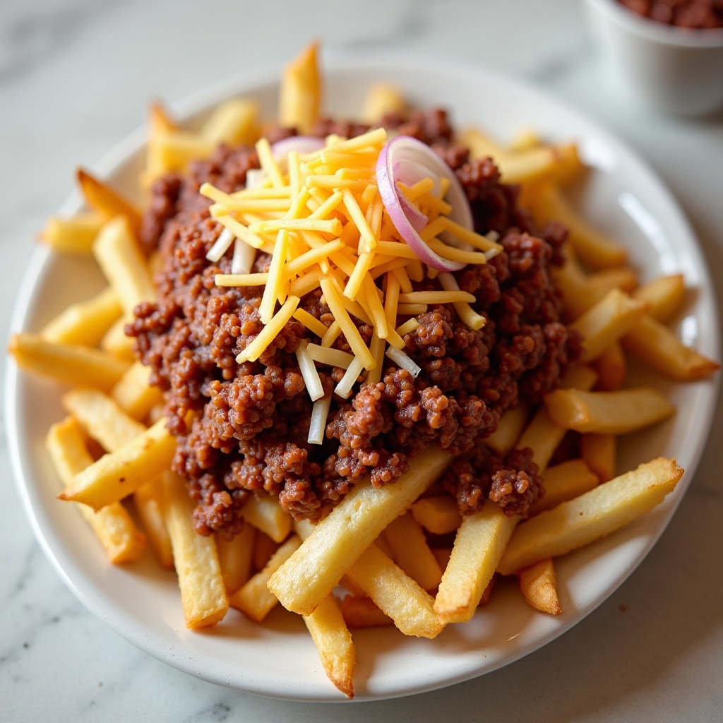 - Una vez que la carne y las patatas estén listas, coloca las patatas fritas en platos individuales. Espolvorea generosamente la salsa sobre las patatas, y espolvorea el queso cheddar rallado por encima.