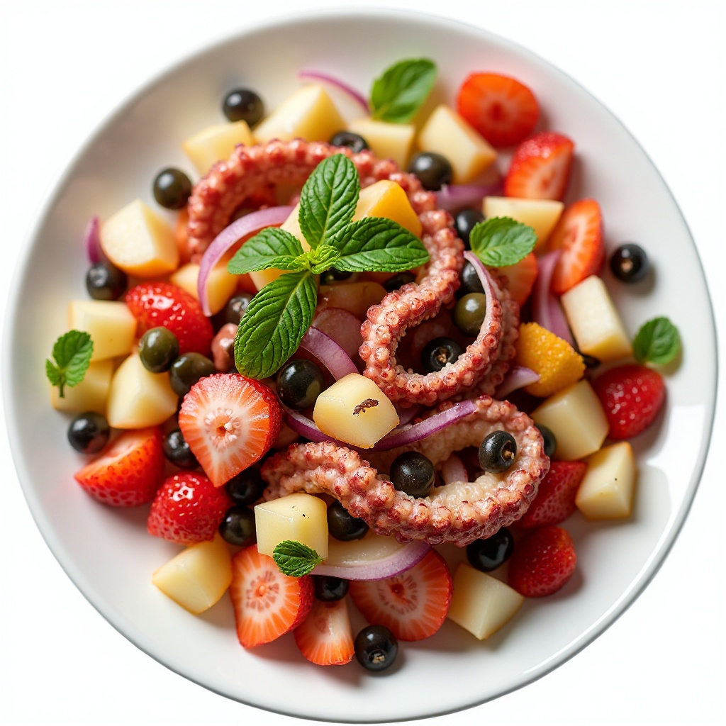 El pulpo es una fuente rica en proteínas y bajo en grasa saturada, lo que lo hace saludable para incluir en una dieta equilibrada. La ensalada de frutas aporta vitaminas y antioxidantes esenciales. Si buscas reducir la grasa del pulpo, puedes optar por cocinarlo al vapor o en papel de horno en lugar de en una sartén.