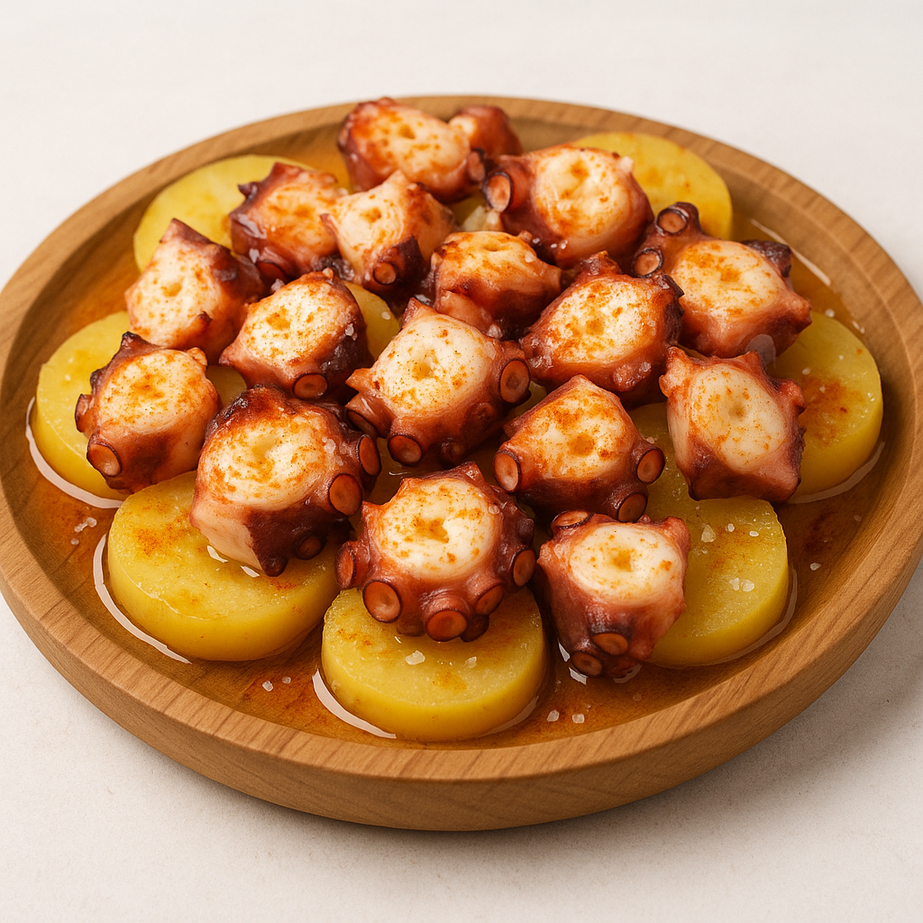 El pulpo a la gallega, también conocido como «pulpo a feira», es un plato emblemático de la gastronomía de Galicia, España. Se caracteriza por su preparación sencilla pero con un sabor intenso, gracias al equilibrio entre el pulpo cocido a la perfección, el aceite de oliva virgen extra, el pimentón y la sal gruesa. Tradicionalmente, se sirve sobre una tabla de madera acompañado de cachelos (patatas gallegas cocidas). Es una receta imprescindible en ferias y festividades gallegas.