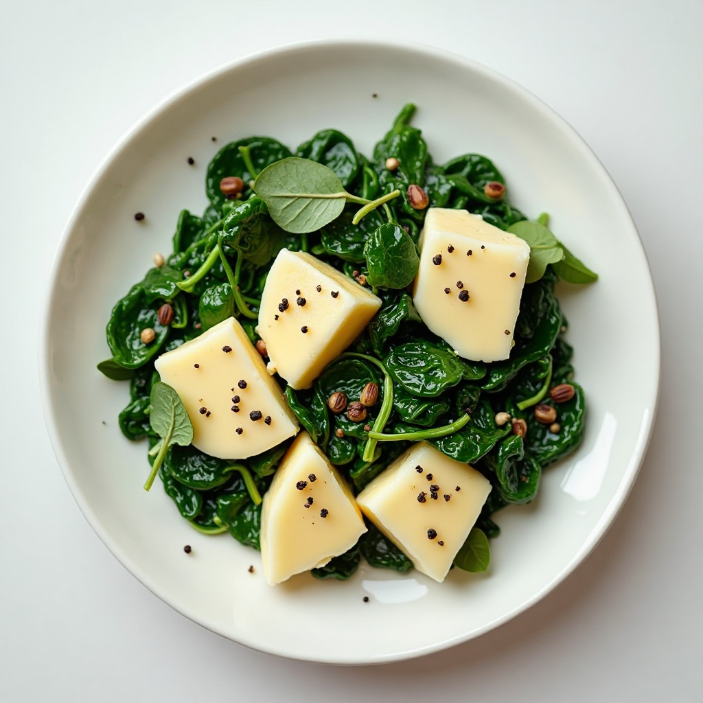 - Añade el queso en rodajas al plato de servir. Sirve las espinacas por encima y decora con nuez moscada y pimienta negra si lo deseas.