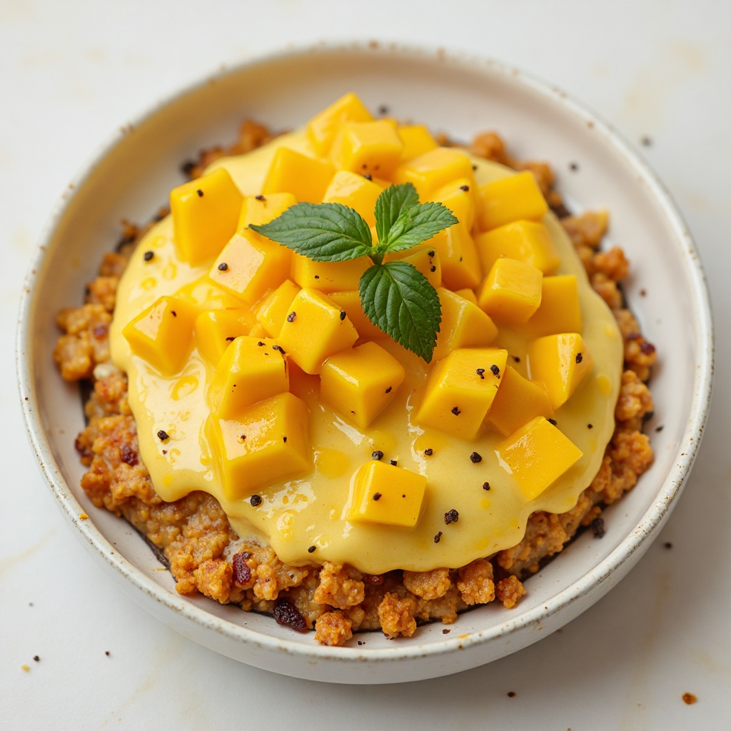 - Coloca el queso en una fuente refractaria y vierte la salsa de mango por encima. Puedes decorar con rodajas de mango adicionales si lo deseas.