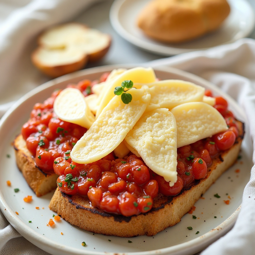 En Girona, España, la región del Empordà es famosa por sus productos lácteos y quesos artesanales. Esta receta presenta un queso local de montaña cubierto con una deliciosa salsa de tomate y especias, servido sobre una tarta de pan tostado, característica de la cocina catalana.