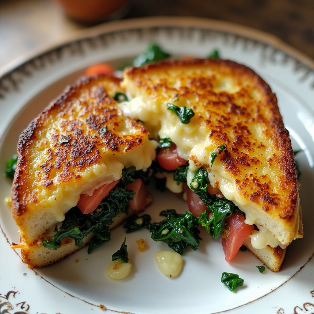 - Cuando el queso esté dorado y su textura sea suave, agrega las espinacas y los tomates. Cocina todo a fuego lento por unos minutos hasta que las espinacas estén casi hechas, pero aún típicamente crujientes.