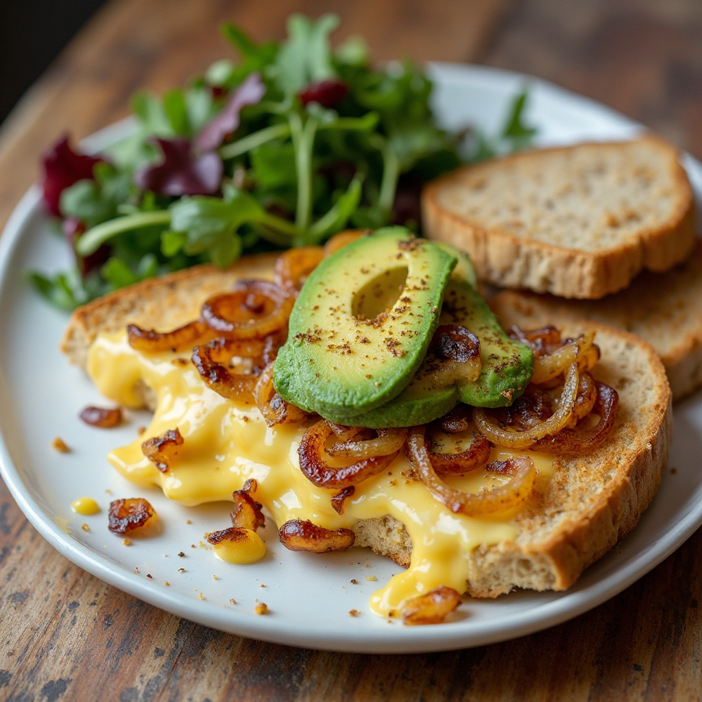 Este plato es rico en grasas saludables provenientes del aguacate y el queso artesanal, además de los nutrientes de la rúcula. La cebolla caramelizada añade un sabor dulce sin exceso de azúcar, y el pan integral proporciona fibra importante. Si prefieres una versión más ligera, puedes reducir la cantidad de queso o utilizar queso menos graso.