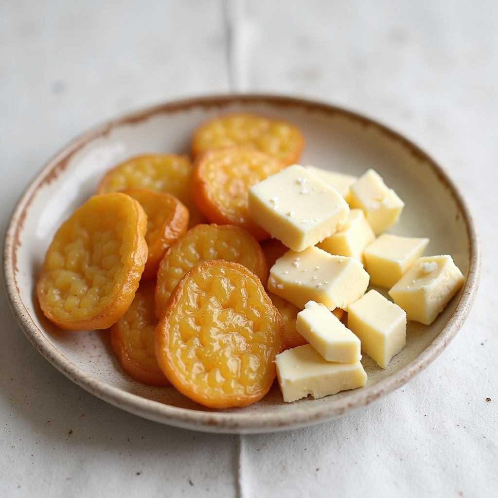 5. Sirve las papas açucaradas caliente, acompañadas de los cubos de queso, disfrutando de la textura cremosa del queso con la dulzura de las papas.