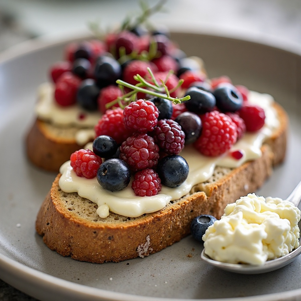 El queso de cabra es una excelente fuente de proteínas y calcio. La mantequilla, aunque alta en grasas saturadas, aporta ácidos grasos esenciales como el ácido butírico, que puede tener beneficios para la salud del cerebro. El pan integral proporciona fibra y nutrientes complejos, mientras que las frutas del bosque ofrecen vitaminas antioxidantes. Esta combinación balancea los sabores y ofrece una experiencia culinaria completa.