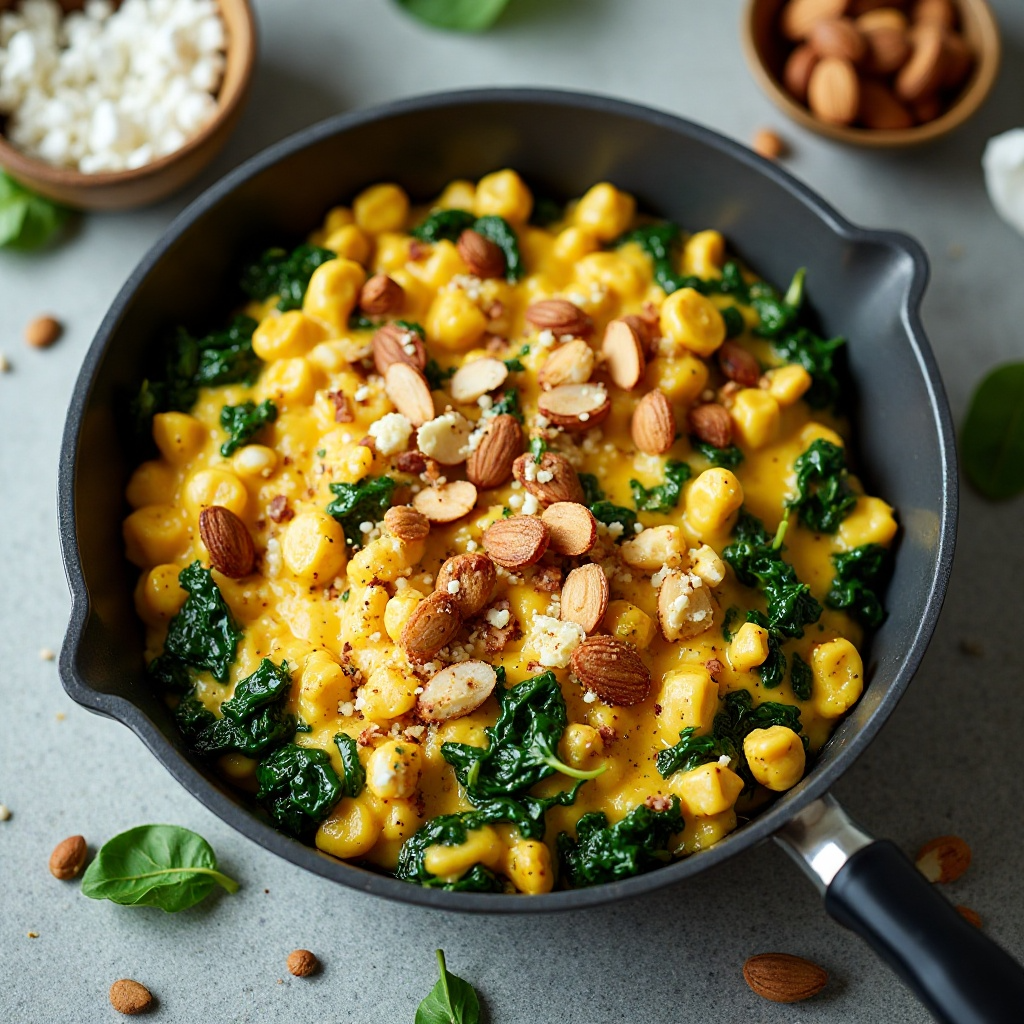 Este plato es una excelente opción para quienes buscan una dieta rica en proteínas y fibra, gracias al queso de cabra y las espinacas. Las almendras aportan grasas saludables y pueden ayudar a controlar los niveles de azúcar en sangre. Además, el curry proporciona antioxidantes que apoyan la salud del corazón y el sistema inmunológico.