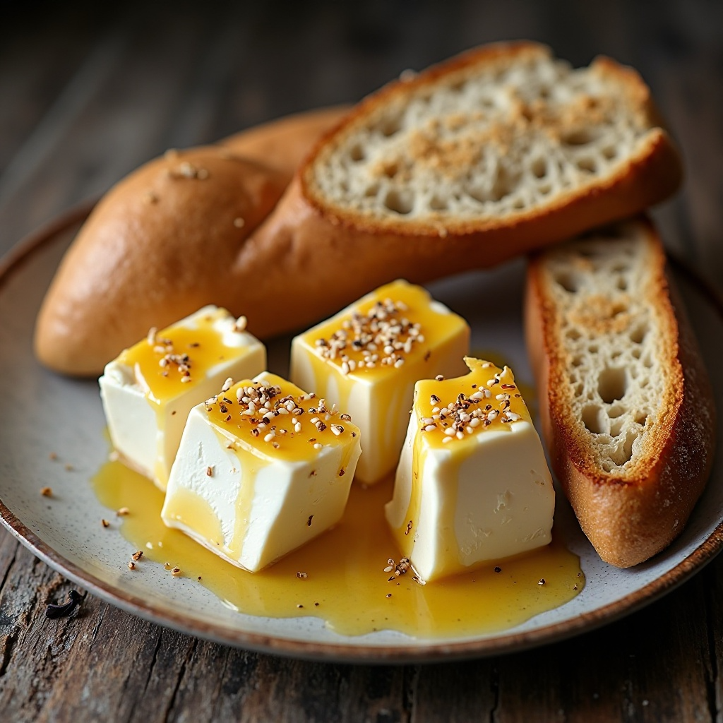 6. Sirve cada cubo de queso con una rodaja de pan rustic, cortada en trozos pequeños, y disfruta del contraste entre el queso cremoso y el pan crujiente.