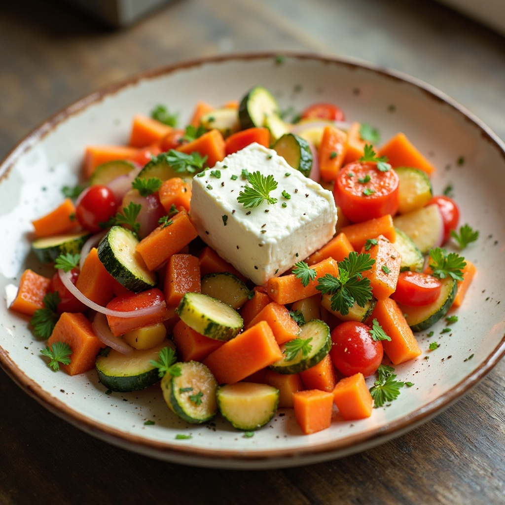 Vergennes, Vermont, es conocida por su producción de queso artesanal de cabra. Esta receta presenta un salteado de verduras frescas y crocantes, acompañado por queso de cabra de Vergennes, realzando así el sabor único del producto local.