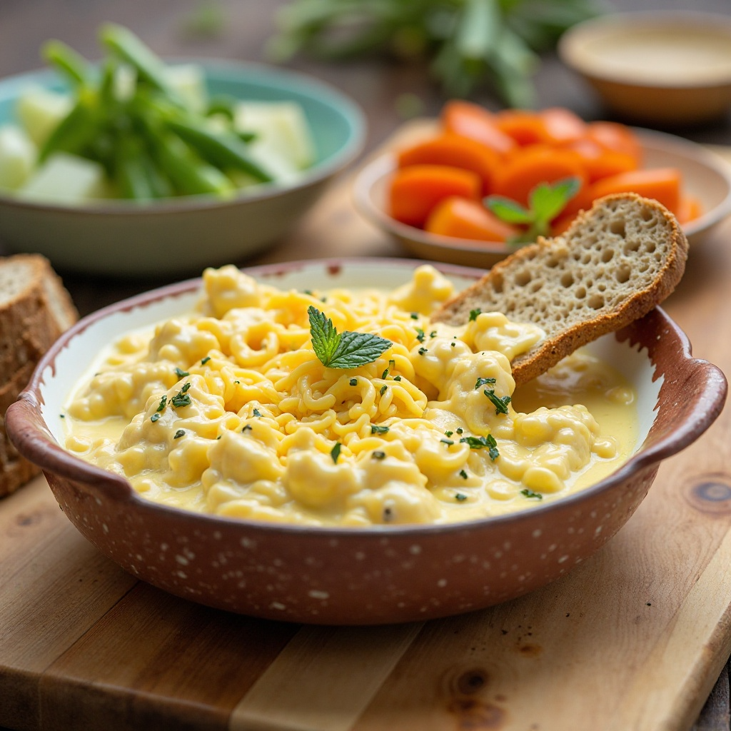 Esta receta es un homenaje al queso artesanal de la granja Moody’s en Waltham, Massachusetts. En lugar de utilizar el queso directamente, lo convertimos en el centro de una fondue de verano, perfecta para reuniones familiares o comidas casuales en días cálidos. La fondue tradicional suele ser de invierno, pero esta versión mantiene el espíritu del queso, adaptándose a la temporada con ingredientes frescos.