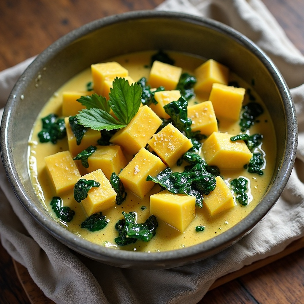 Este plato fusiona los sabores tradicionales de la isla de Mahón, conocida por su queso, con la cocina vegetariana de Algaiaren, una región valenciana que se destaca por su enfoque en ingredientes frescos y locales. El queso de Mahón, con su textura firme y sabor salado, se transforma aquí en un elemento central en una preparación cremosa y aromática que realza las propiedades del curry y las espinacas.