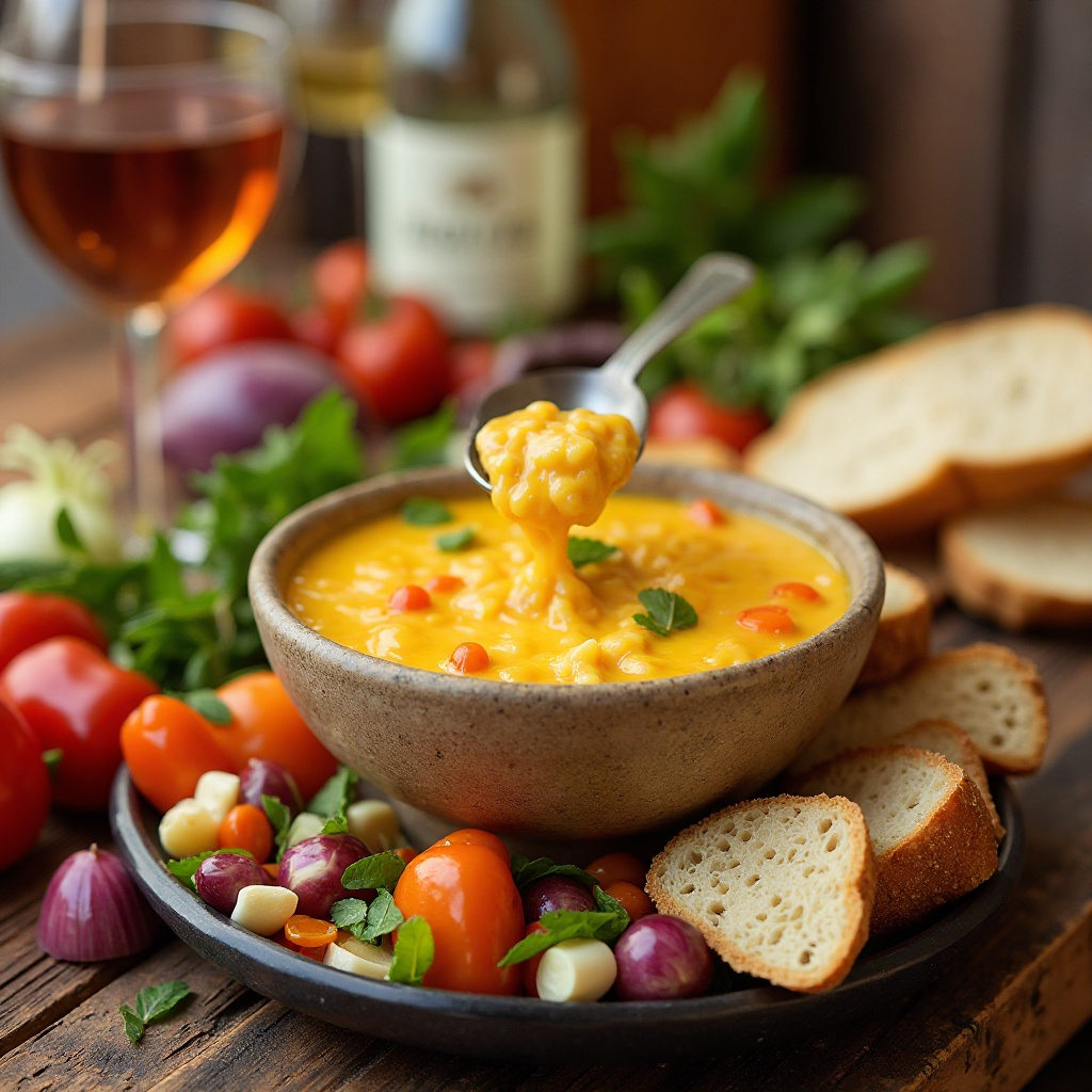 - Sirve la fondue en una olla de fondue o en un cuenco grande con aceite de oliva para mantener los ingredientes calientes. Acompaña con palillos y pan crujiente para mojar en la fondue.