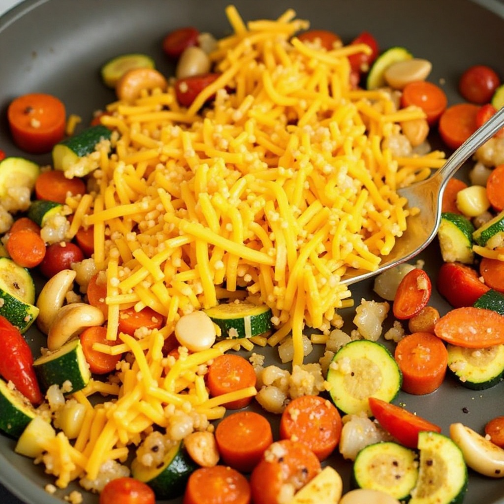 El queso cheddar es rico en proteínas y calcio. Los vegetales asados son bajos en calorías y altos en vitaminas y minerales, aportando una excelente opción para una comida equilibrada. Si prefieres una versión más ligera, puedes reducir la cantidad de aceite usado en el asado o elegir vegetales como brócoli o espinacas para un plato aún más saludable.