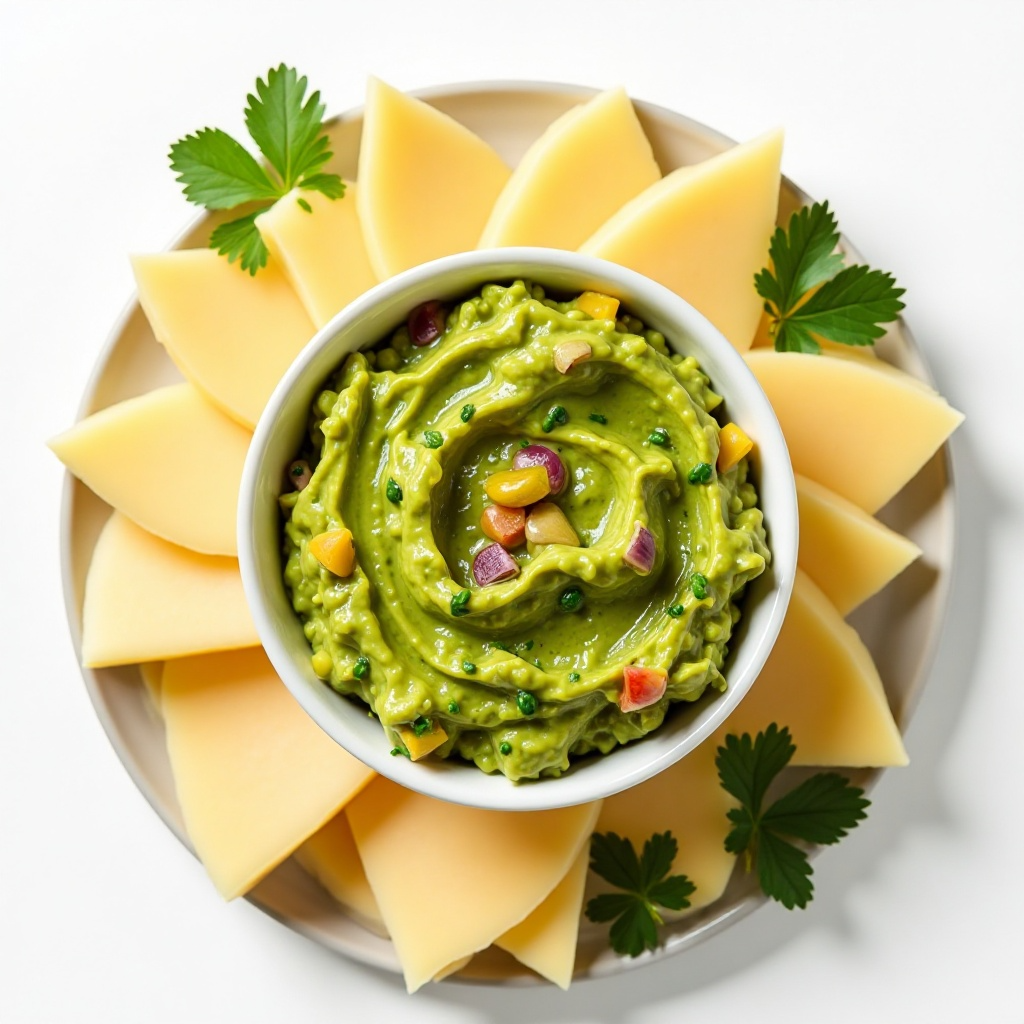 - Sirve el guacamole en un plato y coloca las rodajas de queso Roncal alrededor, o alternativamente, puedes cubrir el guacamole con queso picado para obtener un efecto visual interesante.