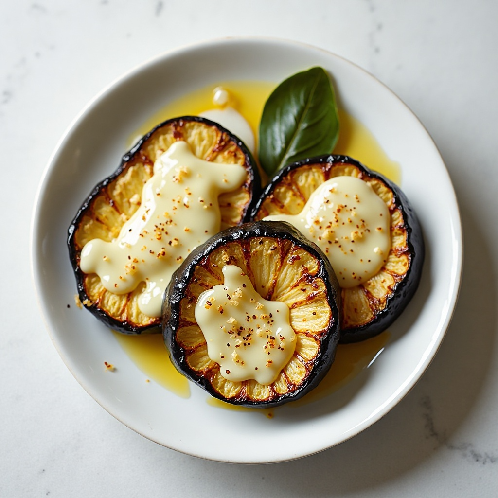 - Precalentar el horno a 180°C (350°F). En una bandeja de horno, coloca las rodajas de berenjena y sazona con sal y pimienta. Hornea por 20 minutos, volteándolas a la mitad, hasta que estén tiernas.