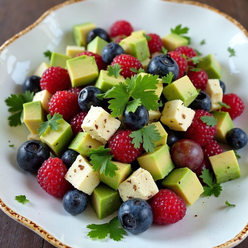 Este plato es saludable debido a los antioxidantes presentes en las frutas frescas y la proteína magra del queso. El aguacate añade grasas saludables, mientras que el cilantro contribuye con su perfil nutricional completo.