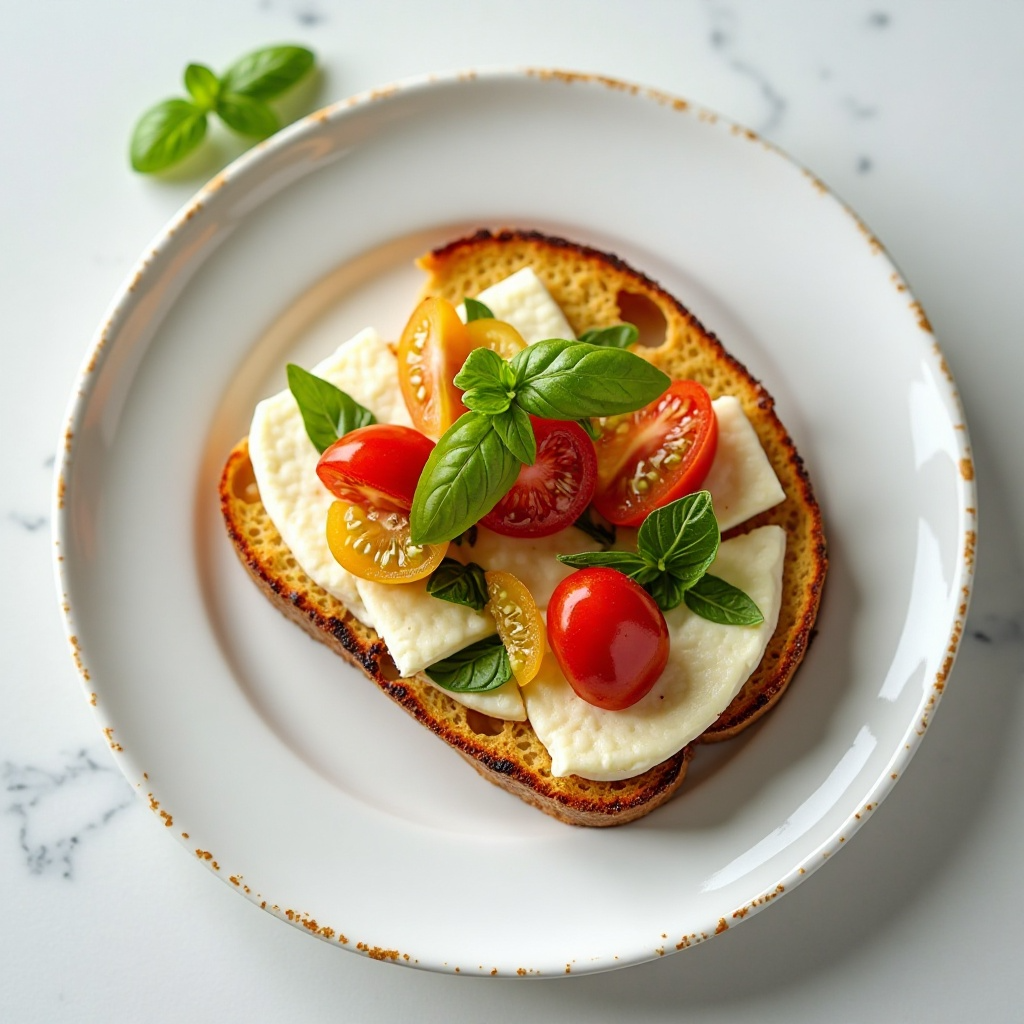 - Sirve inmediatamente, disfrutando de la textura contrastante del pan tostado con el queso suave y el crujiente de las hojas de albahaca.