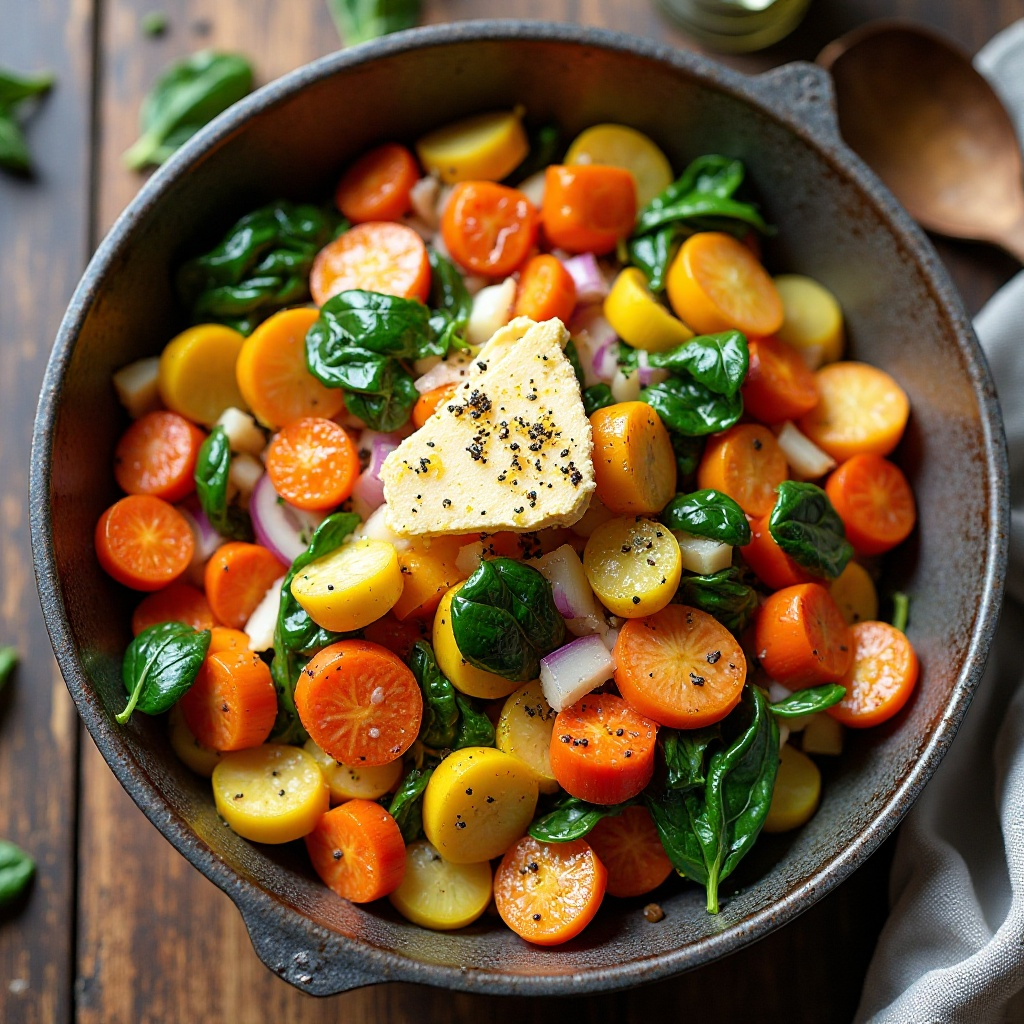 Este salteado de verduras no solo es delicioso, sino también saludable. Las espinacas son ricas en vitaminas y minerales esenciales, mientras que las zanahorias aportan carotenoides beneficiosos para la visión. El queso Flint Hill añade proteínas y grasas saludables, contribuyendo a una dieta equilibrada.