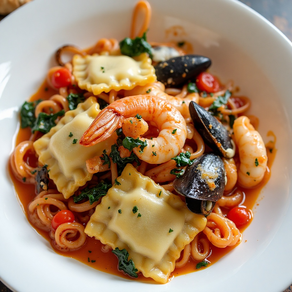 - Saca los raviolis del agua y escúrrelos. Añade los raviolis al plato con la mezcla de mariscos y verduras, revolviendo suavemente para combinarlos.