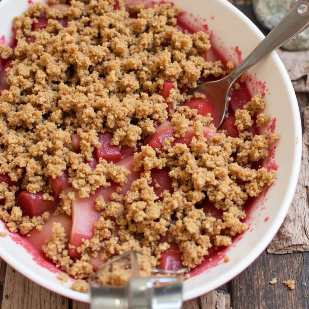 5. Coloca la mezcla de crumble sobre las rodajas de Rhubarb cocidas, asegurando una distribución uniforme.