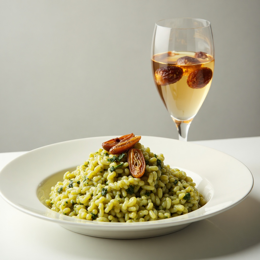 Este risotto es una fuente de energía compleja gracias al arroz y el pesto, mientras que el prosecco ofrece un toque de relajación al contener antioxidantes. Los dátiles aportan fibra y minerales esenciales, aunque debe tenerse en cuenta la cantidad para mantener un equilibrio nutricional.