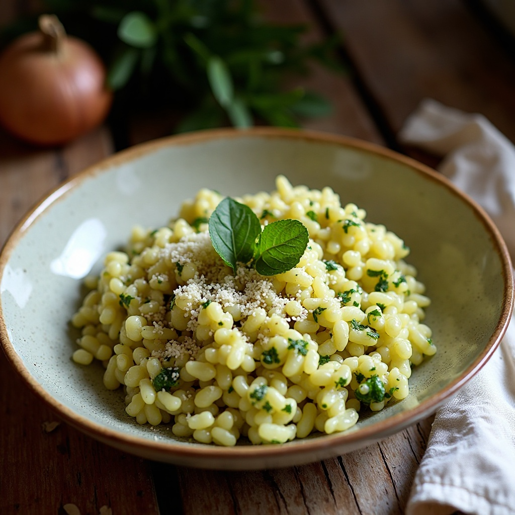 El arroz Arborio es rico en carbohidratos complejos, proporcionando energía sostenida. La albahaca contiene luteína y zeaxantina, antioxidantes que benefician la salud ocular. El aceite de oliva es una fuente saludable de grasas monoinsaturadas, mientras que el parmesano aporta calcio. Sin embargo, para una versión baja en grasa, se puede disminuir el parmesano o reemplazarlo por un queso bajo en grasa.