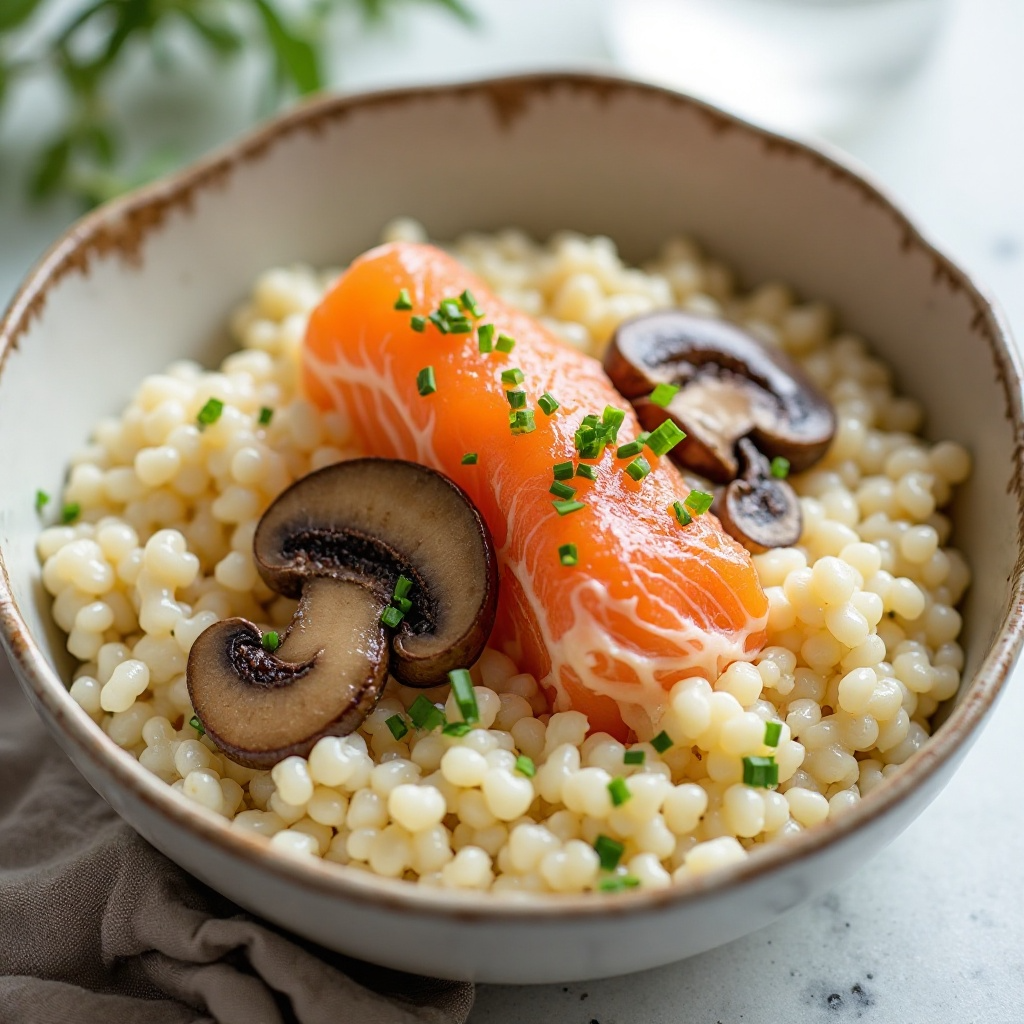 El risotto es un plato rico en carbohidratos complejos, ideal para mantener niveles estables de energía. El salmón ahumado aporta omega-3, esenciales para la salud cardiovascular. Asegúrate de usar caldo de pescado de calidad y considerar opciones sin gluten si es necesario.